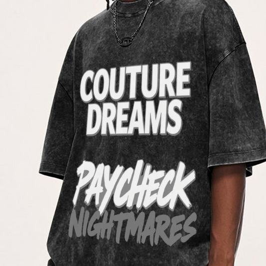 'Couture. Dreams, Paycheck Nighmares' Oversized Unisex Acid Wash T-Shirt